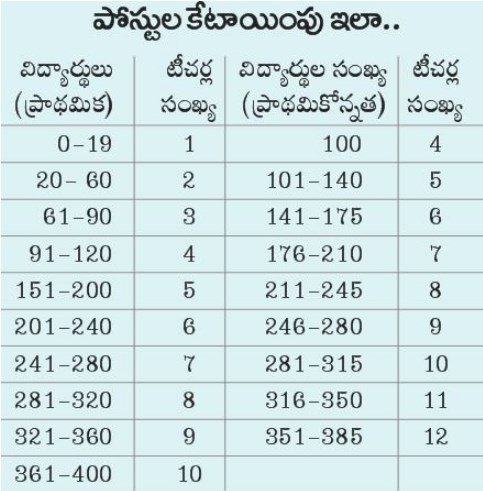 ఒక్క విద్యార్థీ లేని పాఠశాలకు సైతం ఒక ఉపాధ్యాయ పోస్టు ఉంచాలని సూచించినట్లు తెలిసింది. రాష్ట్రంలో ఇంగ్లీష్, గణితం బోధించే సబ్జెక్టు టీచర్లు అవసరానికి మించి ఉన్నట్లు చెబుతున్నారు.రాష్ట్రంలో 1.08 లక్షల మంది ప్రభుత్వ ఉపాధ్యాయులు ఉండగా, అందులో సుమారు 6 వేల ఎస్జిటి పోస్టులు, 8,150 స్కూల్ అసిస్టెంట్ పోస్టులు, 1,970 ప్రధానోపాధ్యాయ పోస్టులు ఖాళీగా ఉన్నాయి. ఇప్పుడు ఉపాధ్యాయులకు పదోన్నతులు ఇస్తే 13 వేల వరకు ఎస్జిటి పోస్టులు ఖాళీ అయ్యే అవకాశముందని ఉపాధ్యాయ సంఘాల నేతలు చెబుతున్నారు. వీటిలో సుమారు ఐదున్నర వేల పోస్టులను ప్రాథమిక పాఠశాలల ప్రధానోపాధ్యాయ పోస్టులుగా మార్చి, మిగిలిన 7 వేలపైగా పోస్టులను డిఇఒ పోల్లో పెట్టే ఆలోచనలో అధికారులున్నట్టు తెలుస్తోంది. అంటే ఆ 7 వేల పోస్టులు ఇక ఉండవని టీచర్స్ యూనియన్లు పేర్కొంటున్నాయి.రాష్ట్రంలో 1.08 లక్షల మంది టీచర్లు ఉండగా, శాంక్షన్డ్ పోస్టులతో పోలిస్తే 12,943 పోస్టులు ఖాళీగా ఉన్నాయని ప్రభుత్వం తెలిపింది. కేవలం ఎలిమెంటరీ ఎడ్యుకేషన్లోనే 9,221 పోస్టులు ఎక్కువగా ఉన్నట్టు చెప్పింది. ఈ క్రమంలో రేషనలైజేషన్ తో ఎక్కువున్న పోస్టులను తగ్గించుకోవచ్చని సర్కారు భావిస్తోంది.