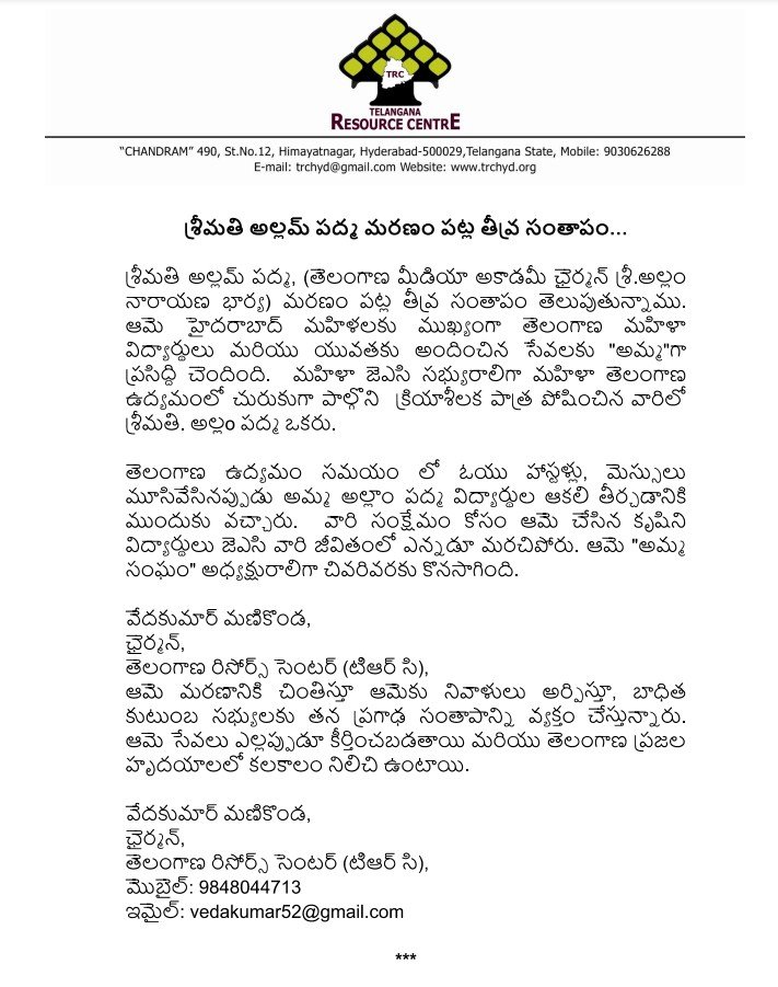 శ్రీమతి అల్లం పద్మ(తెలంగాణ మీడియా అకాడమీ ఛైర్మన్ శ్రీ.అల్లం నారాయణ భార్య) మరణం పట్ల తీవ్ర సంతాపం తెలుపుతున్నాము. ఆమె హైదరాబాద్ మహిళలకు ముఖ్యంగా తెలంగాణ మహిళా విద్యార్థులు మరియు యువతకు అందించిన సేవలకు “అమ్మ”గా ప్రసిద్ధి చెందింది. మహిళా జెఎసి సభ్యురాలిగా మహిళా తెలంగాణ ఉద్యమంలో చురుకుగా పాల్గొని క్రియాశీలక పాత్ర పోషించిన వారిలో శ్రీ. అల్లo పద్మ ఒకరు.